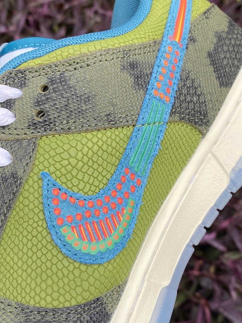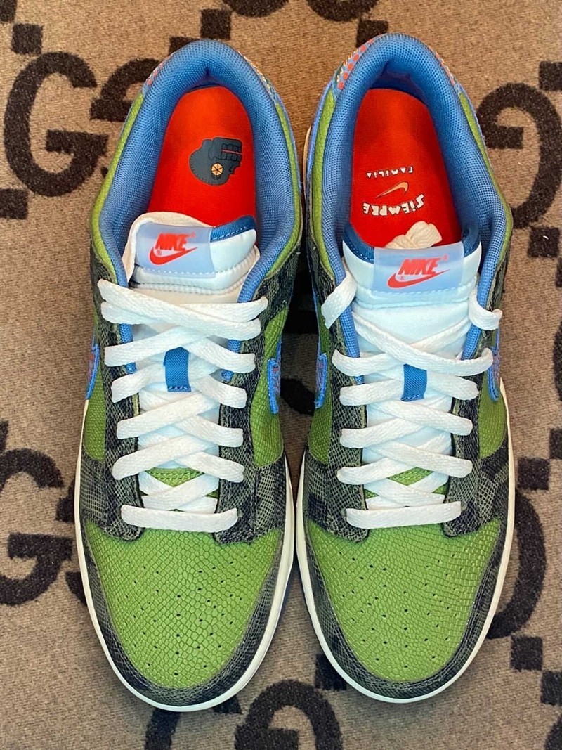最近一款全新配色的 Nike Dunk Low 在网络上曝光了实物图,整双鞋使用绿色和墨绿色蛇纹搭配,鞋侧面的 Swoosh Logo 用拉丁美洲的图腾图案绘制,鞋垫上还印有 “Siempre Familia” 的字体,细节满满。