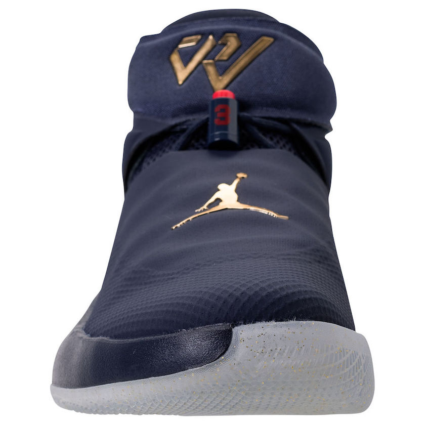这款 “Tribute” 就是以他们俩高中校队的球服配色为灵感,将午夜蓝、金色以及白色注入威少首款实战鞋款之中,打造出一双致敬意味十足的 Jordan Why Not Zer0.1 “Tribute”。其大底以及鞋带扣印有两人的球衣号码,而鞋舌部分则印有威少手写的“KB3”字样。