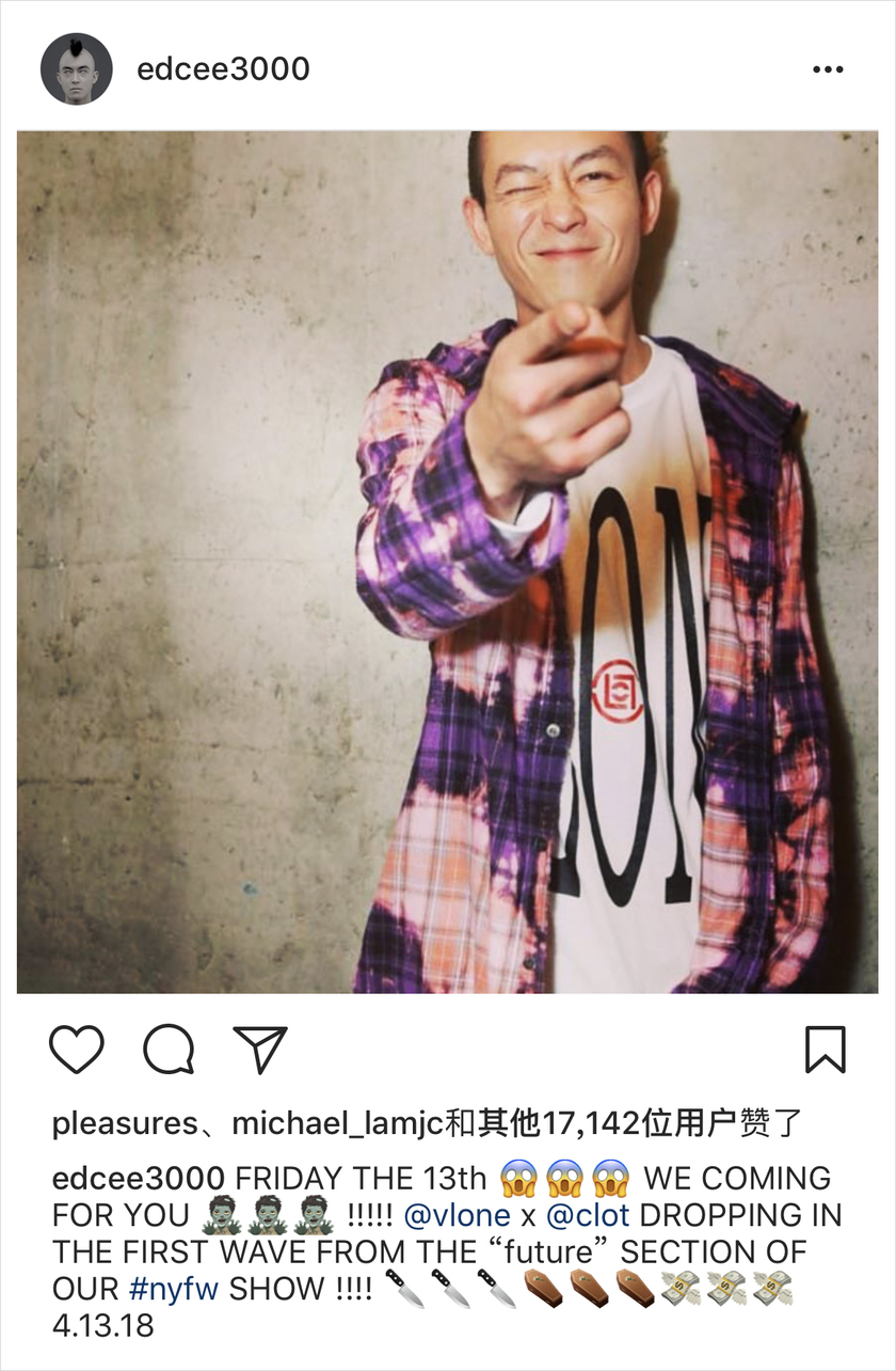 近日,陈冠希在个人INS上宣告,包括图中这件陈冠希同款 T-Shirt 在内的 VLONE x CLOT 联名单品将在 4 月 13 日开售!不过在 VLONE 品牌影响力大势已去的情况下,你是否还会因为陈冠希而再次入手呢?