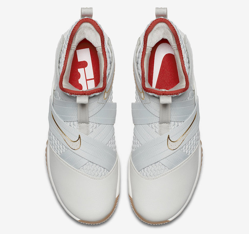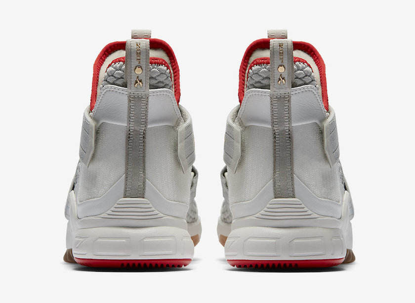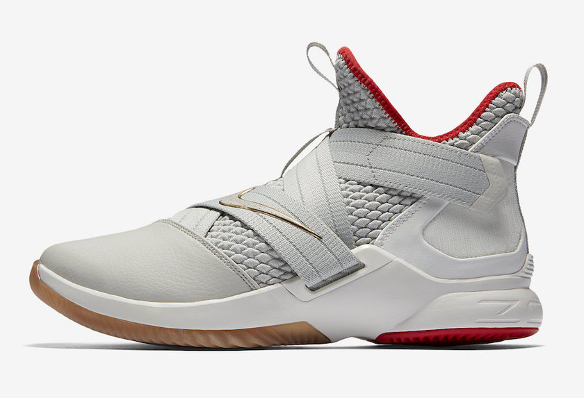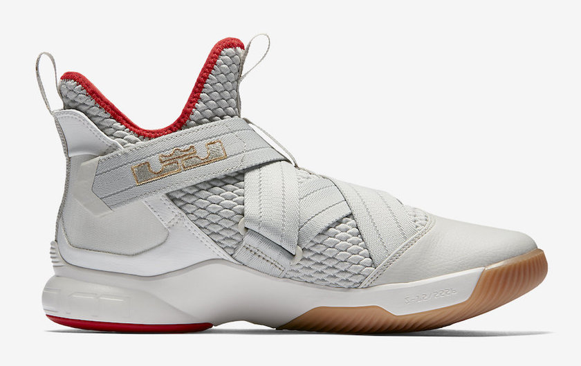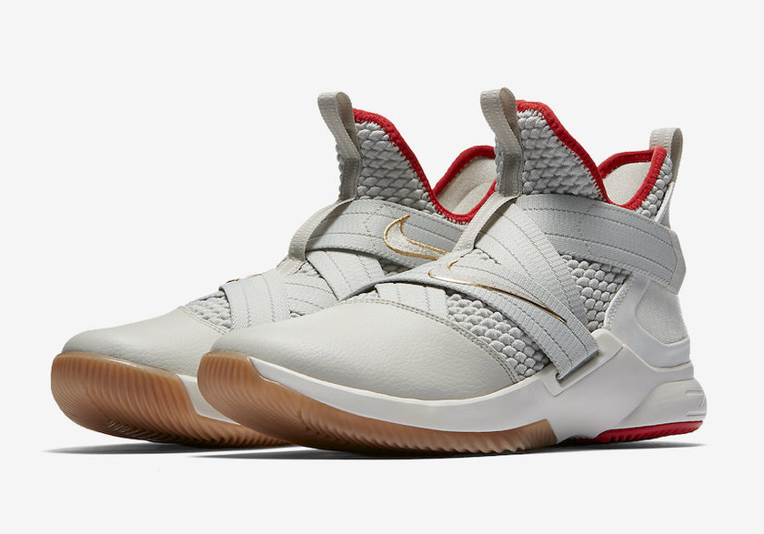 此番 LeBron Soldier 12 采用比较中性的灰白色调,内衬以及后掌大底采用鲜红色调装点,而绑带上的 Nike Swoosh 以及皇冠 Logo 则以金色装扮呈现,搭配前掌生胶大底,整体配色极为类似曾经的 Nike Yeezy 2。