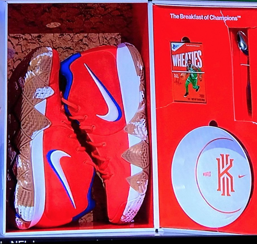 近日,欧文在社交平台上释出了一款特殊版本的 Nike Kyrie 4 “Wheaties” 套装,其独特的包装和超限量100双的货量,相信已经吸引了不少大收藏家的目光。