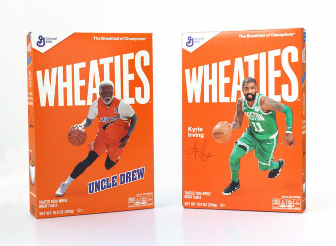 这款 Nike Kyrie 4 “Wheaties” 套装采用 Wheaties 麦片盒的设计,外观除了印有身着凯尔特人11号球衣的欧文之外,还印有电影《Uncle Drew》中欧文扮演的德鲁大叔。