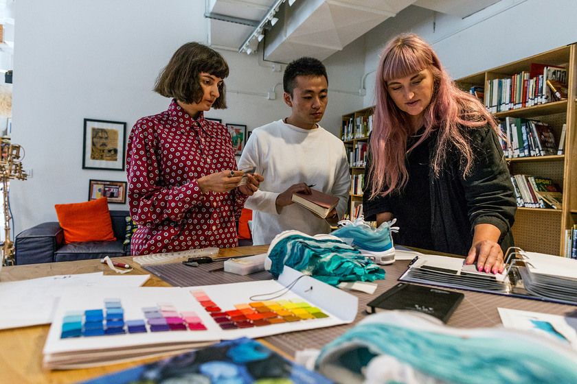 设计预览环节中茹秋石与鞋类设计师Jesi Small和材料设计师Vessela Yordanova一起探讨并尝试不同的样品调色板。