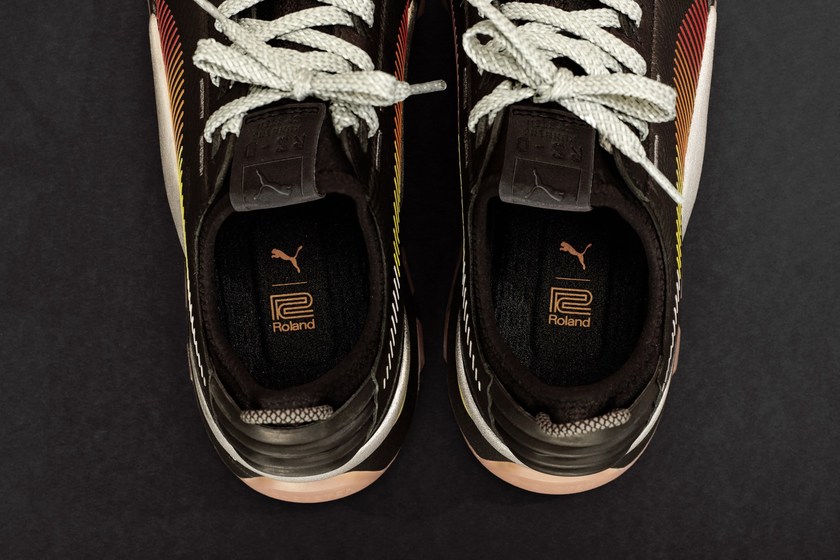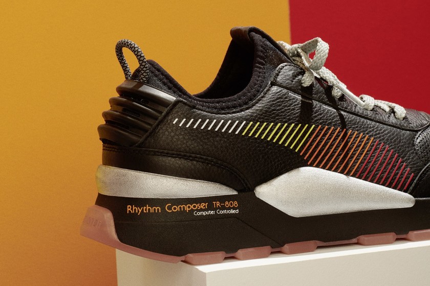 灵感均来自 Roland 公司革命性的 TR-808 鼓机,其中 RS-0 Roland 采用黑色优质皮革打造鞋面,PUMA 经典的跑道条纹以 TR-808 标志性红橙黄配色的线条渐变而成,中底上更饰有“Rhythm Composer”和“Bass Drum”等字样;