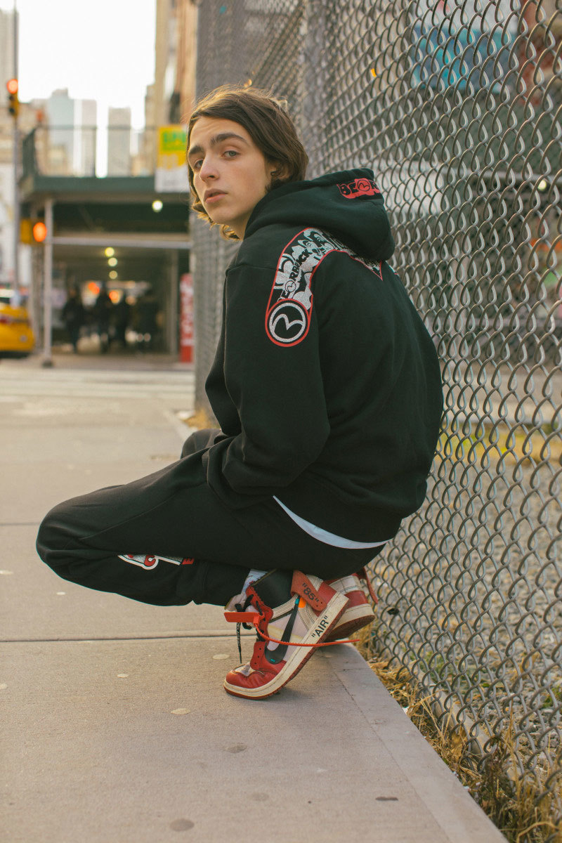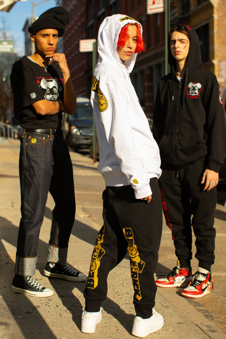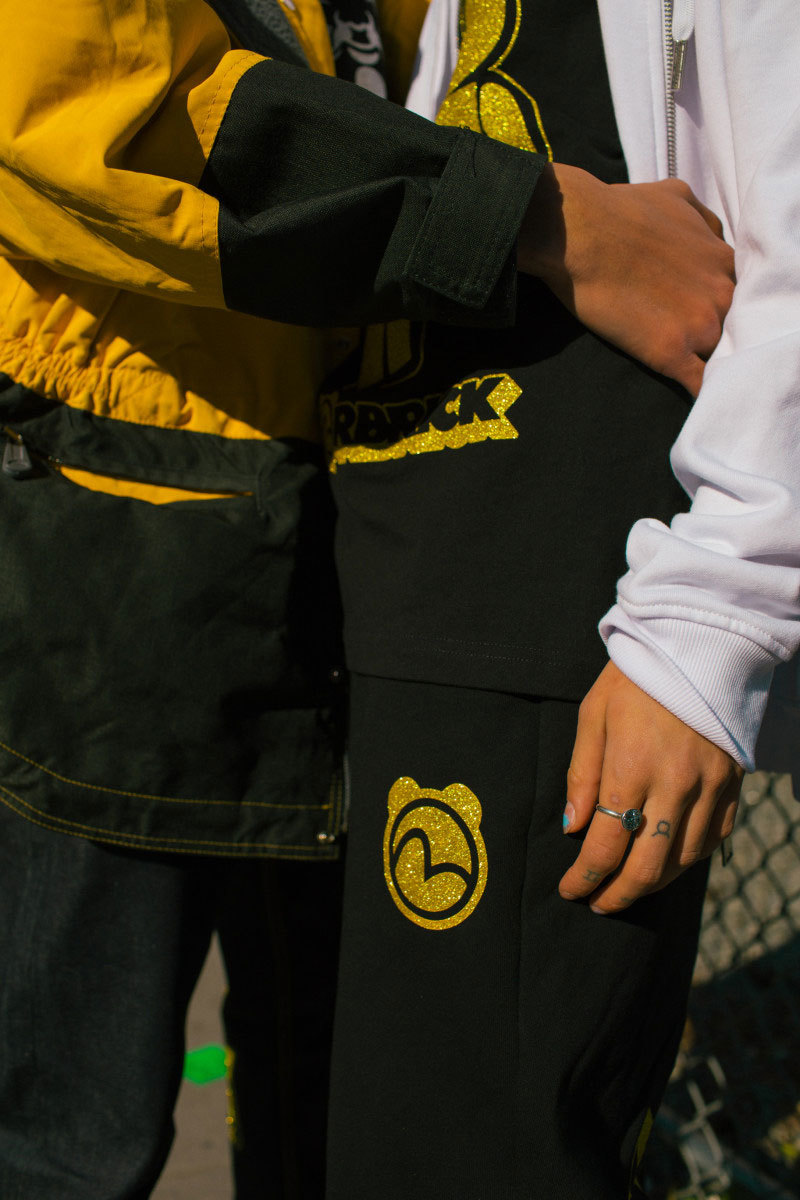服饰上风格与玩偶大径相同,以玩偶的头像做衣服印花,并配以 “品质保证” 四个大字,透过金,银,黑色的闪粉工艺,让单品更具吸引力。