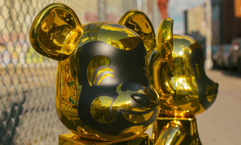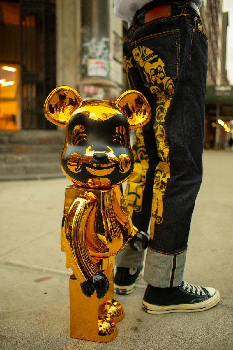 玩偶以 BE@RBRICK 积木熊为基础,再配以 EVISU 标志性的海鸥 Logo 、佛头、家花图案突出日本传统文化的特色。通过金、银、黑三种配色呈现出来的佛头笑脸,极具节日氛围,目前联名包含 1000%、400%、100% 三种尺寸。