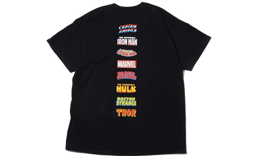 这次联名系列在设计上注入了漫威的几个经典漫画角色,蜘蛛侠、钢铁侠、绿巨人、美队都被印在了 T-Shirt 上,还点缀了角色的名字和口头禅。此外还有黑白两个颜色的 Logo T-Shirt 供以选择,漫威迷们不要错过了~