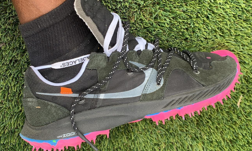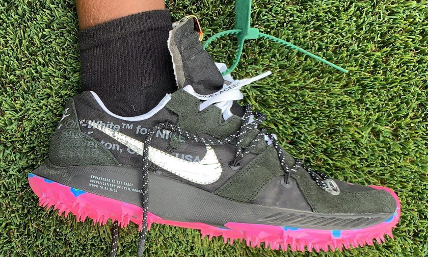 以 Air Zoom Terra Kiger 为蓝本,这款联名再次融入了解构设计。黑色鞋面搭配大号银色 Swoosh ,内侧饰有标志性的 Off-White 字体,加上橙色 tag ,“半成品”鞋舌,以及鞋带与 the ten 系列设计颇为相似。粉色的大底则又是一大亮点,增加了吸睛度。