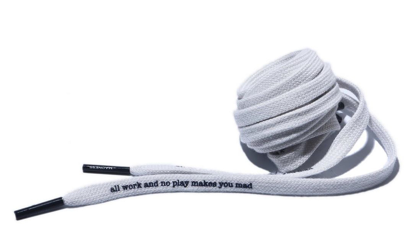 而 3M 反光材料的融入也让鞋款在弱光环境下更为耀眼。此外本次还多款鞋带附赠,除了官方米白鞋带之外,还带有印了 MADNESS 品牌字句的白色鞋带,以及充满户外特色的萤光斑点圆形鞋带。