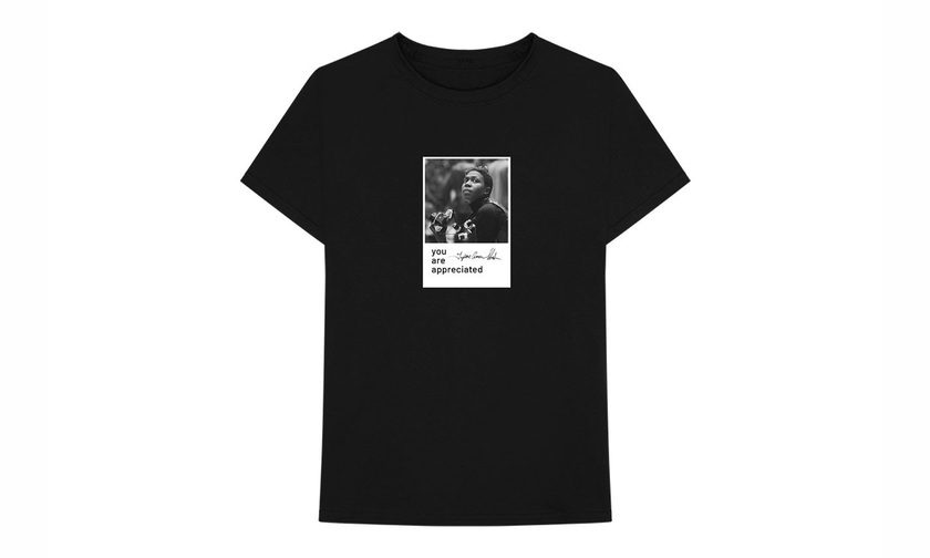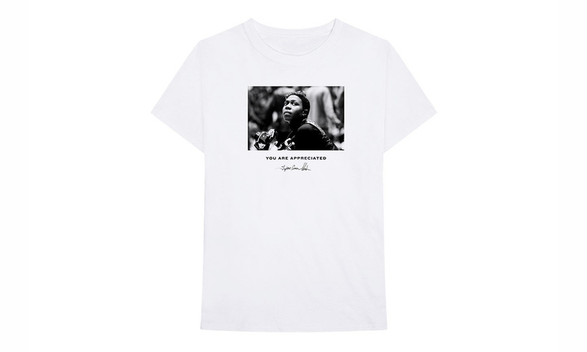 单品包括了黑白两色 T 恤以及帽衫,以 Tupac 母亲 Afeni Shakur 为主打设计,单品胸前印上了她手持相机的黑白肖像照片以及“You Are Appreciated” 标语。