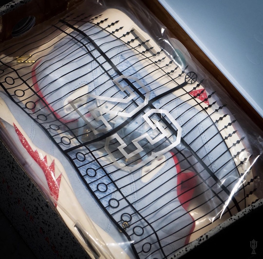这款Trophy Room x Air Jordan 5冰蓝鞋身采用了类似麂皮一类的翻毛皮材质,因此有着绝佳的视觉效果。使用红色点缀外底的鲨鱼纹图案和内衬,形成鲜明的色彩对比。在鞋垫则做了形如木质纹理的专属设计。