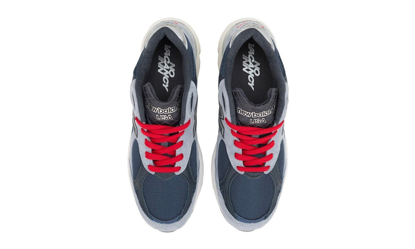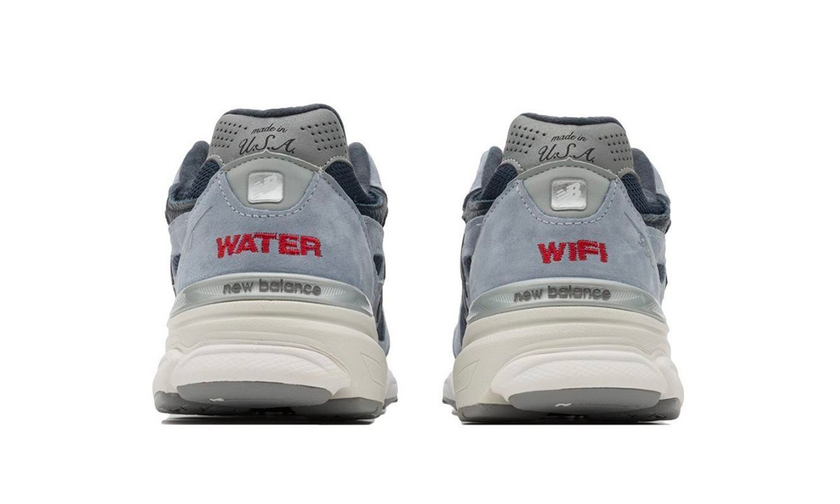 鞋款以美产 990 v3 为蓝本,灰蓝色麂皮搭配海军蓝网眼材质打造的鞋身质感丰富,银色反光“NB”logo 耀眼非凡。红色鞋带及后跟处红色“WATER”“WIFI”刺绣与整体色调形成鲜明对比,非常抢眼。