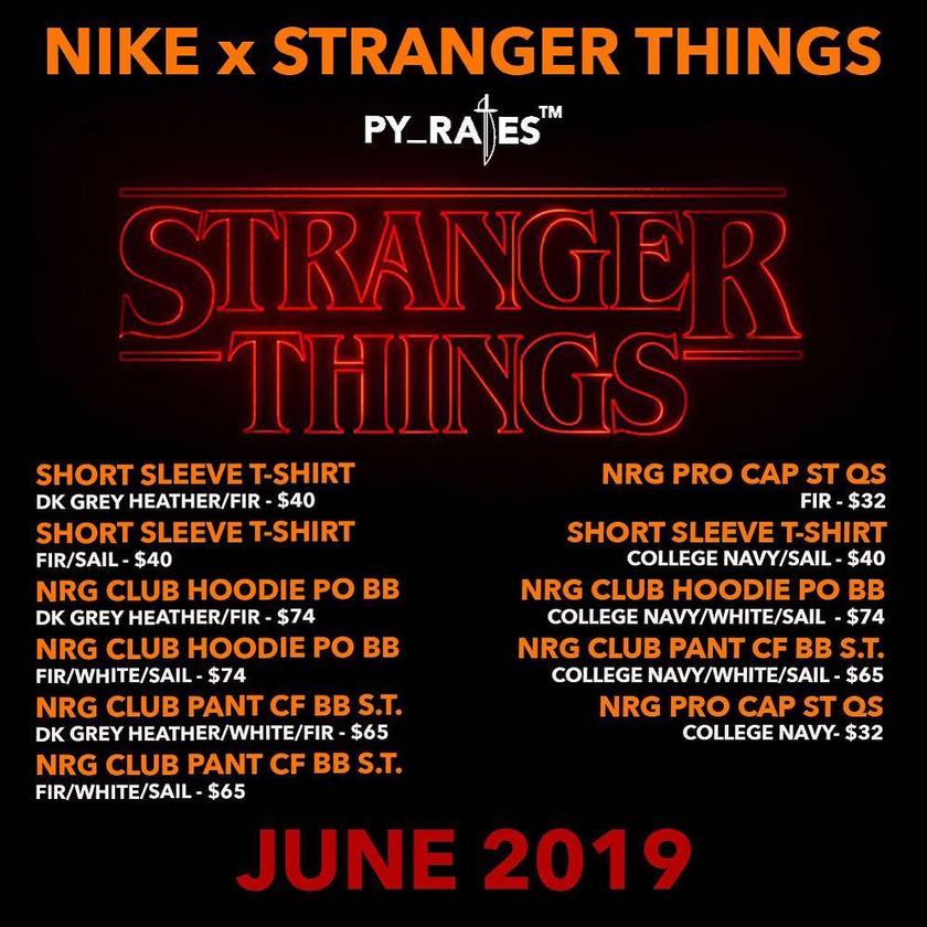 《怪奇物语》第三季将于7月4日在美国 Netflix 首播,为了给这部大热剧集造势,《怪奇物语》将携手 Nike 推出联名系列。根据 @py_rates 的爆料,此番系列将带来T恤、卫衣、短裤等单品,会在6 月底和 7 月初分两次发售。虽然目前还没有谍照释出,但这两方强强联手,相信会给大家带来惊喜。剧迷们不要错过这个系列啦~