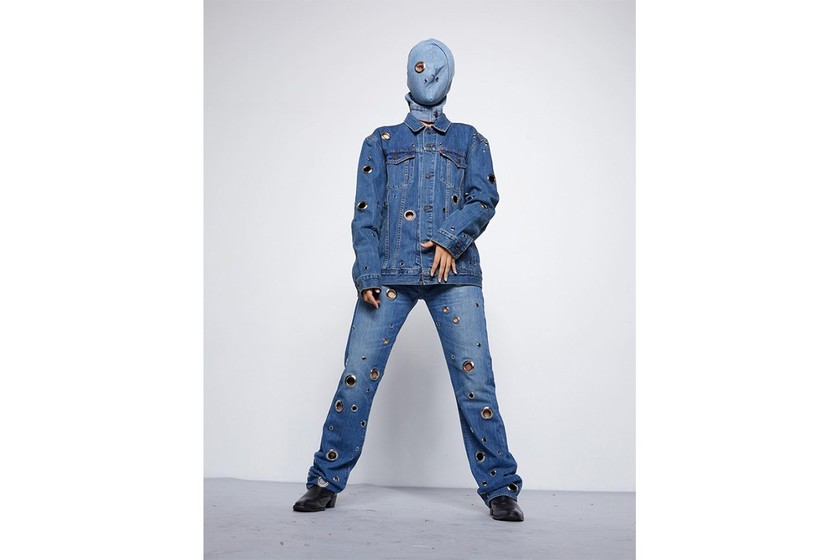 不同丹宁面料拼图重组,牛仔与皮革缝制呈现等等设计方式让人叹为观止。而本次最“亮眼”的大概是打满圆孔眼的牛仔套装,密集恐惧症根本不敢看。此外,裤袋拼接呈现的全新夹克视觉效果也颇为神奇。