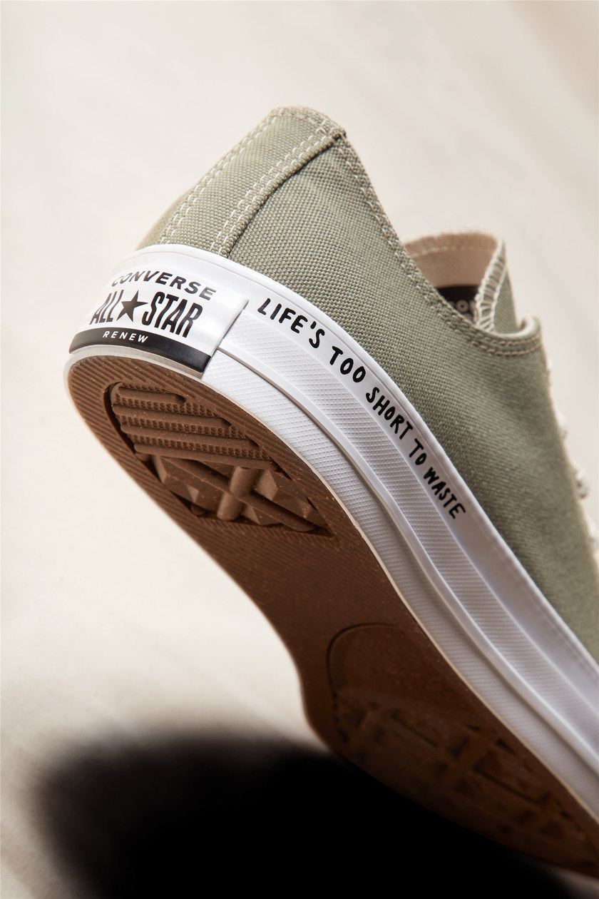 这一系列利用消费废品及工业废料打造而成,包括了Converse Renew Canvas、Converse Renew Denim 及 Converse Renew Cotton 三个系列。Converse Renew Canvas 是完全由废塑料瓶中的提取的再生聚酯纤维打造,Converse Renew Denim则由二手丹宁牛仔裤转化而来,Converse Renew Cotton则是再生混合物制品。
