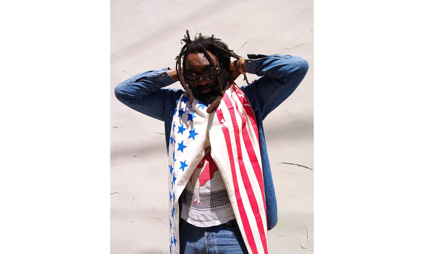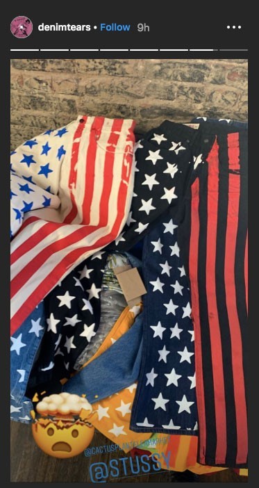 我们可以看到 Tremaine Emory 脖子上挂着一条以星条旗元素设计的牛仔裤,造型非常搞怪。并且他还展示了以星条旗为主题打造的各种色调的同系列单品,并且暗示将于7月4日登场。