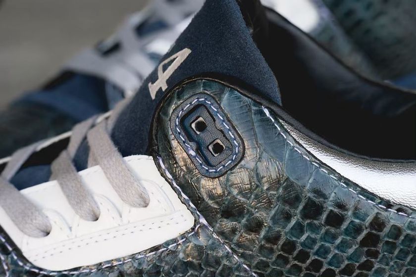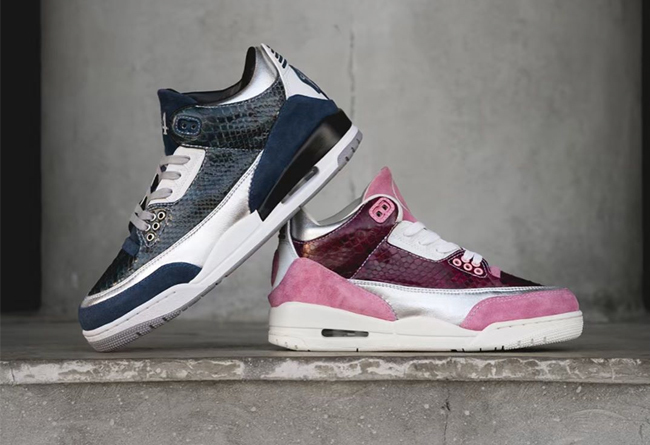 我们可以看到这两款 AJ 3 ,一款以墨蓝色为主打,另一款以粉色为主调演绎。蟒纹元素搭配银色细节以及高级麂皮,呈现出迷人的魅力。鞋舌和后跟处点缀的图案,彰显了鞋款的特殊身份,精致无比。