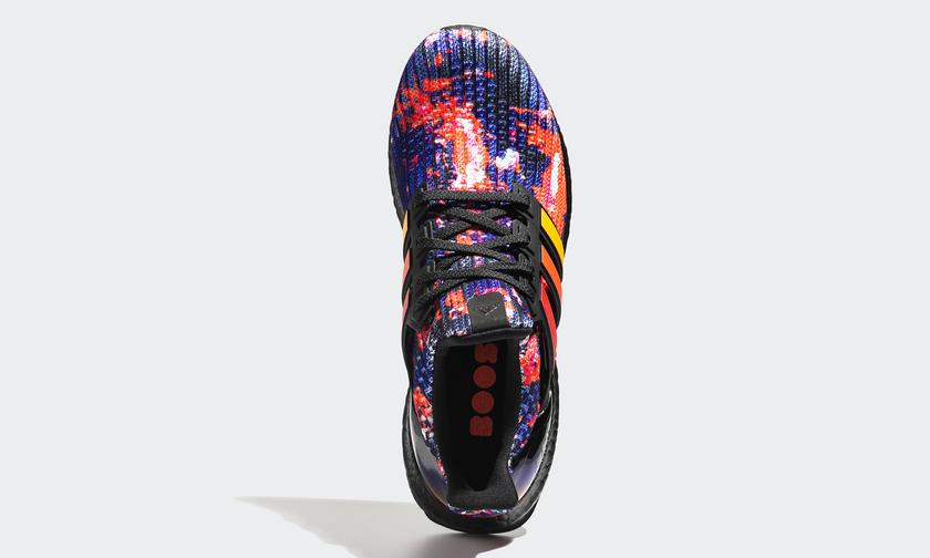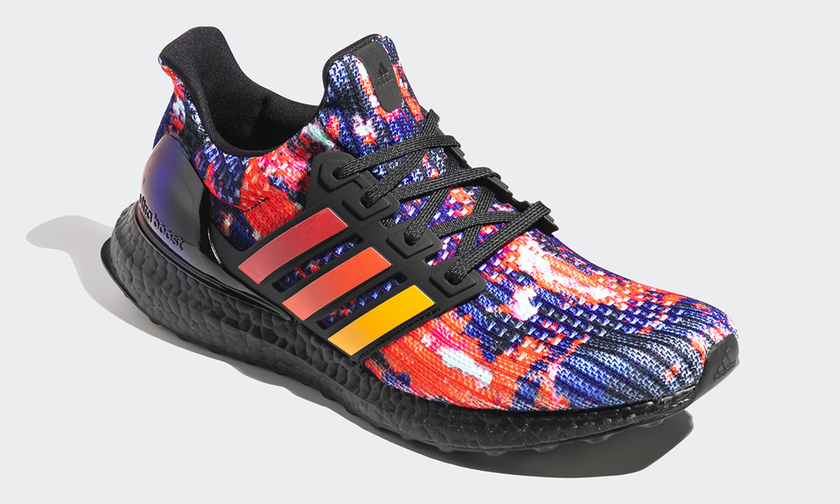 这款配色 Primeknit 鞋面上覆盖了彩色热感图,代表着各地变幻莫测的天气。鞋侧色调不同的三道杠和后跟支撑的幻彩设计,堪称整个配色的点睛之笔。最后搭载黑色 Boost 中底和大底,吸睛度爆棚。