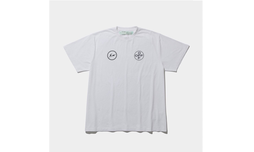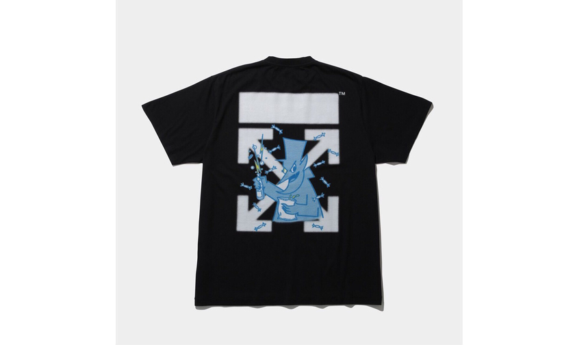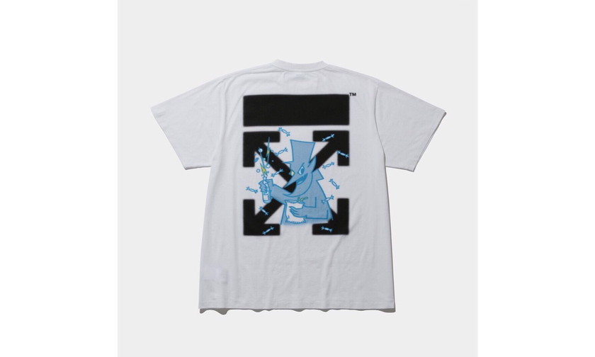 这次联名除了藤原浩曝光的黑色 T 恤外,还有一款白色 T 恤。两款设计一样,正面均以双方 logo 呈现,背面印有 OW 经典箭头与卡通图案的组合印花。