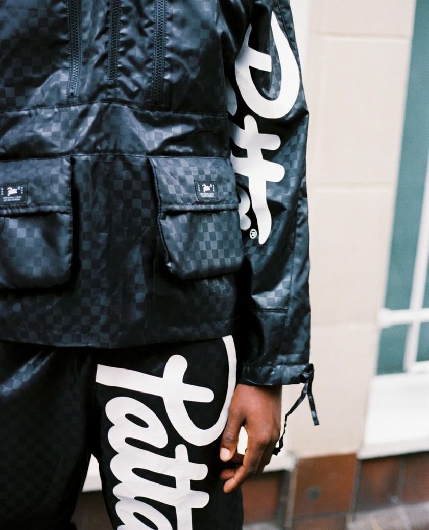 双方的这次联名系列以机能性作为设计点,打造了包括防水夹克外套及运动短裤在内的多款单品。其中防水夹克以黑色为主调,棋盘格暗纹贯穿整体,搭配显眼的白色胶印 “Patta” logo ,辨识度极高。此外,背面的交叉背带细节,设计感极强,让人一看就很心动。