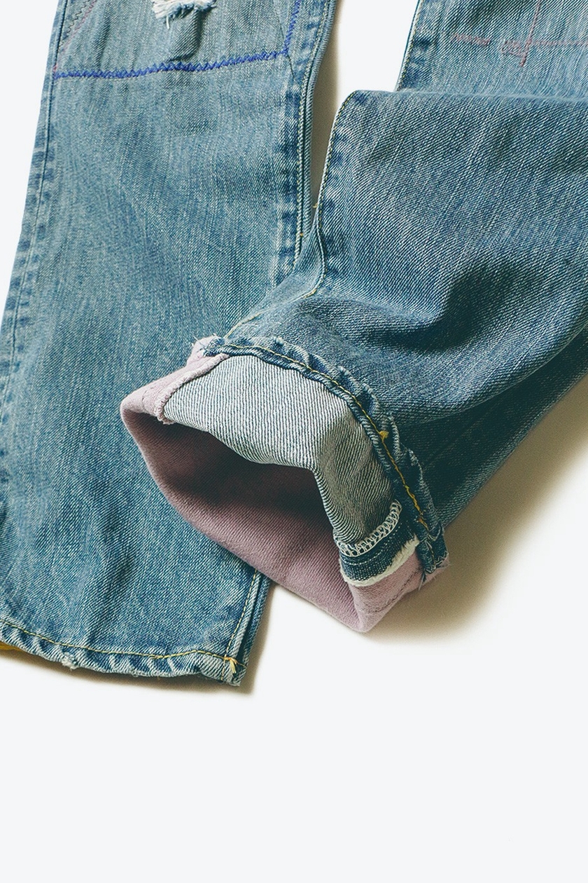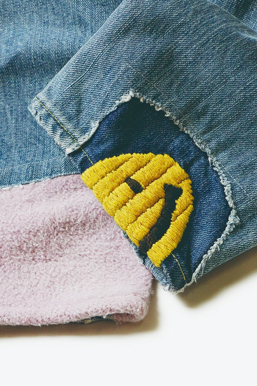 近日,KAPITAL 再度带回了一款人气单品 14oz Denim 5P OKABILLY 牛仔裤。这款牛仔裤以 KAPITAL 惯用的拼接手法打造,灯芯绒碎花布、淡紫色抓绒材质和深浅丹宁材质的结合让这款单品民族风浓厚,而独特的黄色笑脸图案的注入,也让这款牛仔裤辨识度极强。
