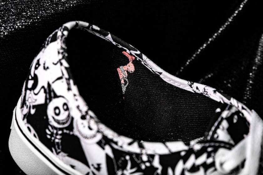 系列每款鞋都带有电影中的几个角色,暗黑风格加细节文字,彰显本次主题。此外,Authentic 内衬中还隐藏了一个复活节兔子印花,而 Slip-On 鞋面上也点缀了一个独特的杰克蝙蝠领结。
