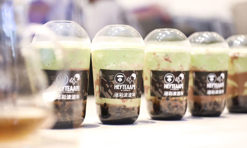 近日,在国内人气爆棚的网红奶茶店喜茶 HEYTEA 与 AAPE 合作推出了联名单品。本次联名喜茶方面推出了限定联名饮品“迷彩波波冰”,并在上海港汇恒隆广场喜茶 LAB 店开设了 “HEYTEAAPE STORE” 限定主题店,主题店布满了迷彩元素及 AAPE 标志性 “Moon Face Logo” ,已经正式营业。