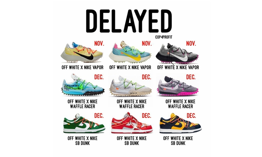 消息由知名 ins 情报账号 @cop4profit 透露,据悉,Off-White x Nike Vapor Street 将延至 11 月发售,而 Off-White x Waffle Racer 与关注度最高的 Off-White x SB Dunk Low 系列则要等到在 12 月才会正式登场。