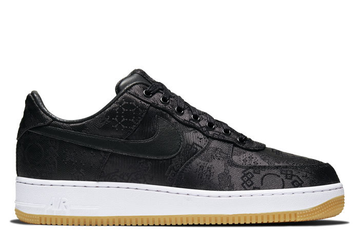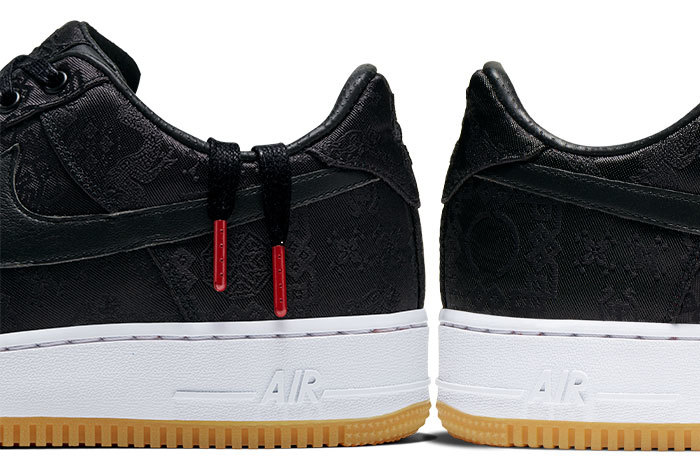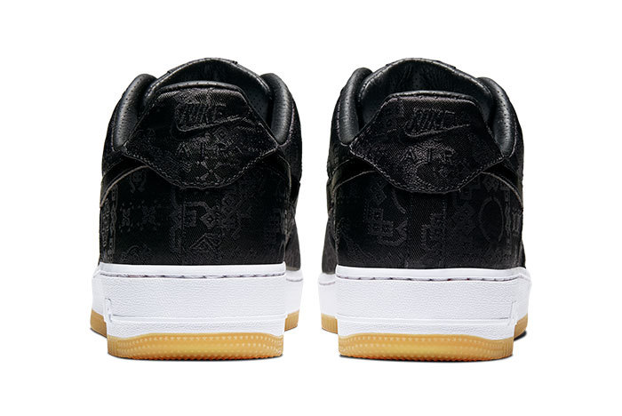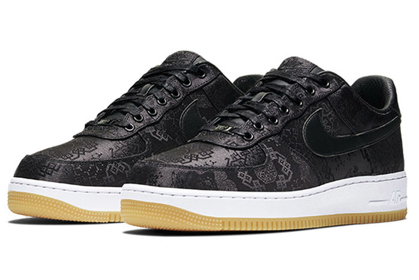 依旧延续了 CLOT x Nike Air Force 1 丝绸系列的标志性设计,这款纯黑丝绸鞋面也以传统中国结、龙纹印花点缀,搭配白色中底和生胶色大底,经典复古气质尽显。