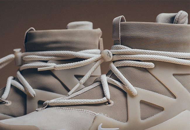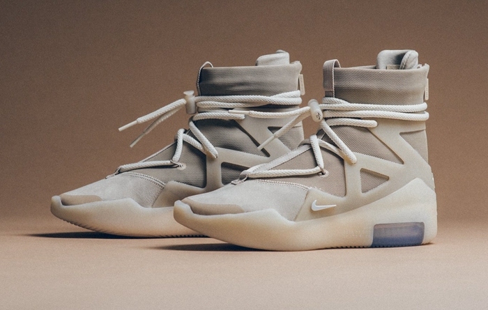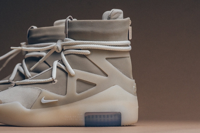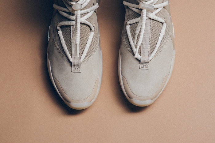 这款配色延续了 Air Fear Of God 1 一贯的高帮设计,燕麦色与浅灰色麂皮、网布的结合,带来十足的保暖属性。