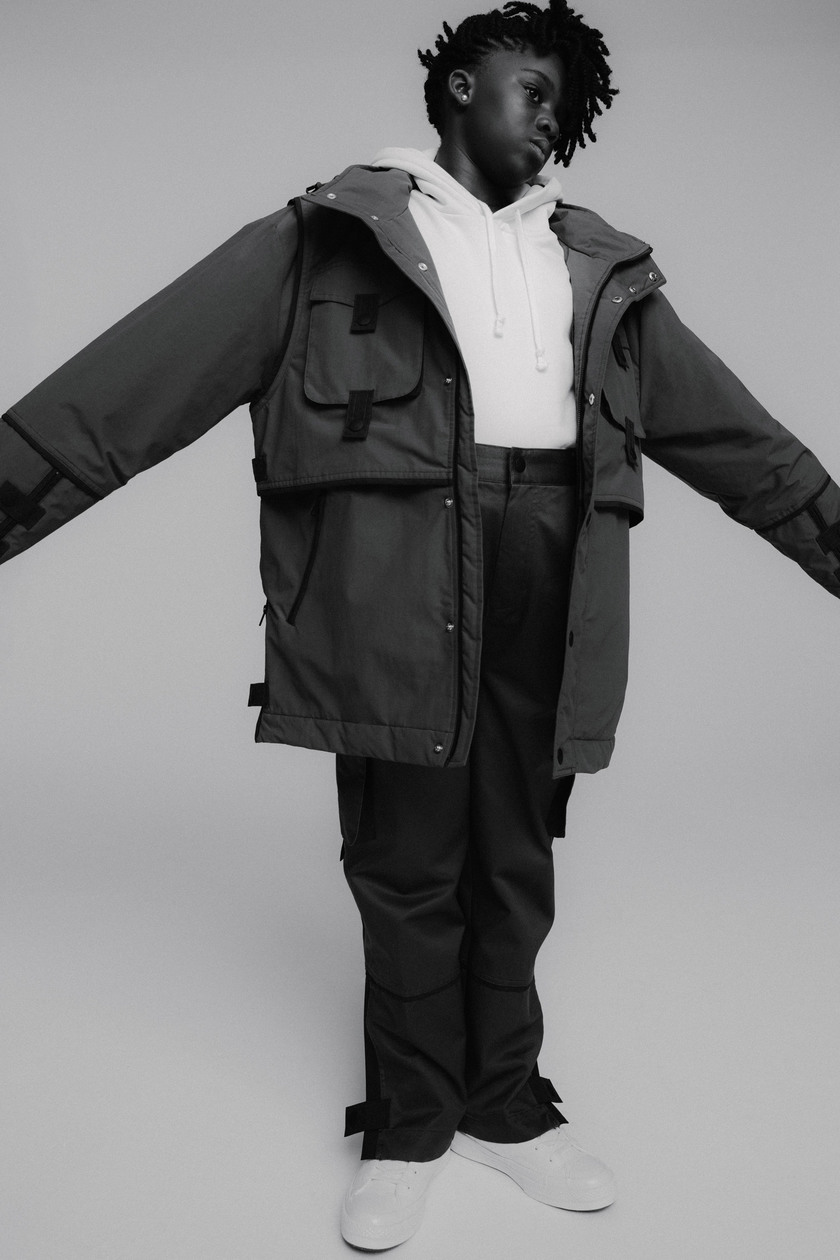 系列单品包括结构化剪裁的夹克外套、连帽卫衣、正面双层面料 Tee、裤装以及帽款。