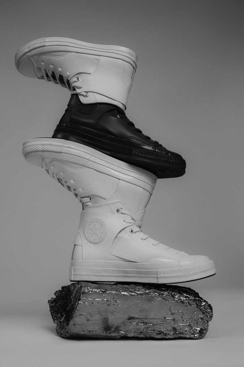 而最值得关注的还是灵感来自雨靴和攀登靴的 Chuck 70 ,它包含了雪峰白和深瓦灰两种配色,层叠设计手法的贯穿,吸睛度极强。