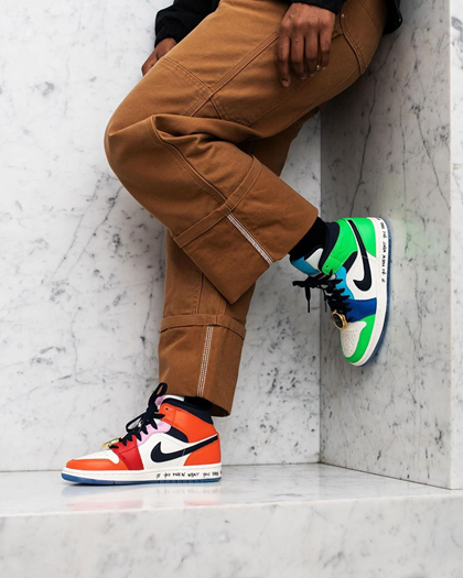 Fearless系列中鞋款众多,但是一下就让我们记住,辨识度极高的绝对是这双由·洛杉矶时装品牌 ME 主理人 Melody Ehsani和Jordan Brand带来的AJ1 Mid。这双鞋的两只鞋除了大底和主鞋身的白色之外没有一处使用相同的配色,既有着五彩斑斓的视觉效果,又形成了两只鞋鸳鸯的设计,真的是踩着彩虹走过去了。