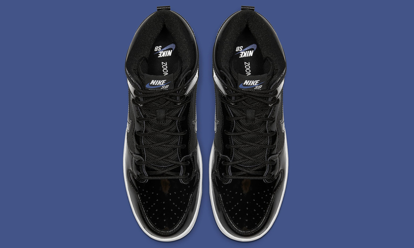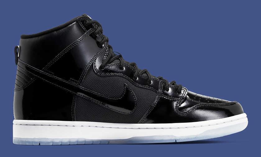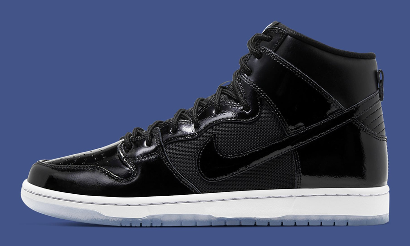 SB Dunk 高帮鞋身采用黑色漆皮打造,搭配白色中底和水晶外底,呈现熟悉的大灌篮气质。鞋舌和鞋侧编织材质,后跟拉环处“SB”字样,则致敬大灌篮细节,还原度极高。