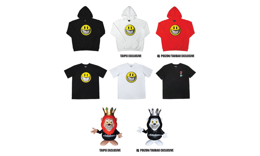 包括三色笑脸卫衣、两款 T-Shirt 以及双色玩偶等单品,其中红色公仔和白色卫衣为台北限定,黑色公仔和红色卫衣为大陆限定。