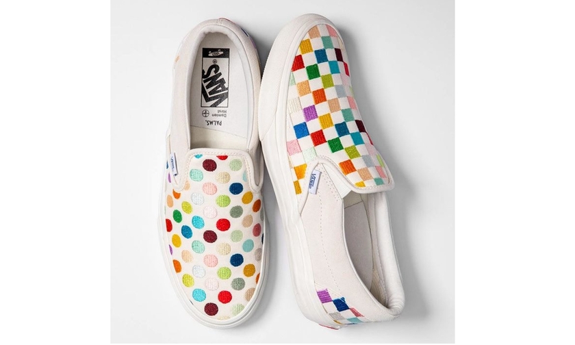 系列以彩色波点、彩色格纹、街头涂鸦以及 Damien Hirst 个人艺术作品为主打元素。Slip-On 鞋款与众不同的“鸳鸯”设计,更增强了吸引力与艺术气息。