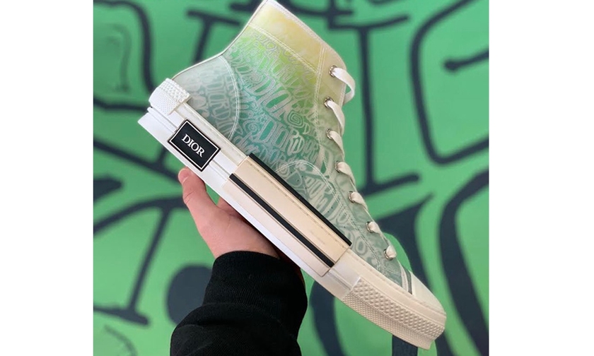 可以看到这双方的联名潮流感十足,鞋身以黄绿渐变色调主打,Dior x Shawn Stussy 涂鸦满印,吸睛效果和辨识度极强。再搭载具有解构主义风格的白色硫化中底,整体外观惊艳值极高。