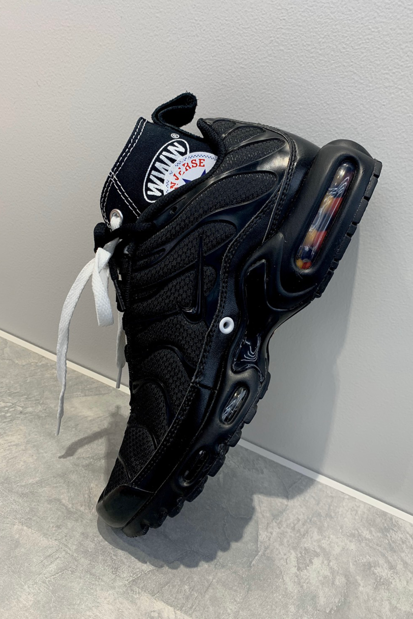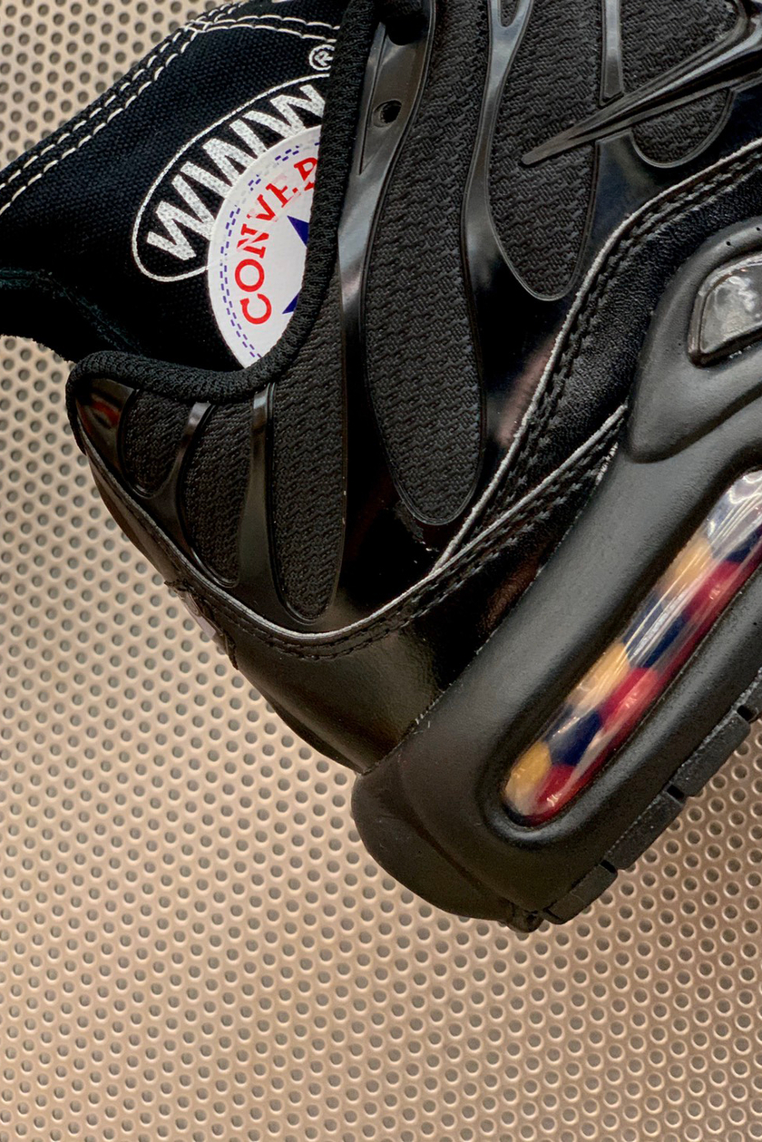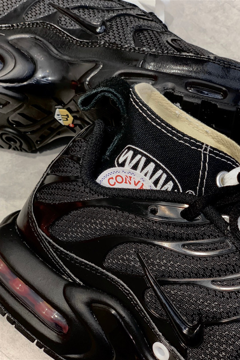 Chuck Taylor 鞋面作为“内靴”出现在了 Nike Air Max Plus 内部,全黑色贯穿的整体,搭配 WWWESH STUDIO 和 HEIGHTENEDSENSE 的标识,低调冷酷又吸睛。