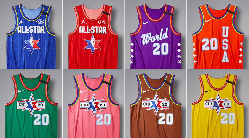 而由于全明星赛将在芝加哥举行,所以贯穿芝加哥的 8 条地铁线路色彩将作为主色彩注入到 8 款不同球衣上。蓝色和红色用于全明星正赛球衣;紫色和橙色用于新秀赛球衣;绿色和粉色用于名人赛球衣;棕色和黄色则用于 NBA 关怀行动主办的特殊奥运会统一篮球比赛球衣。