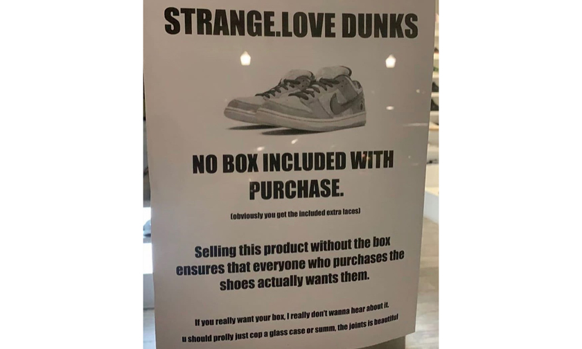 美国乔治亚州的 Clockwork 滑板店作为本次 StrangeLove 发售门店之一,对于这种现象决定从根本杜绝炒卖。贴出发售出的 Dunk 不提供盒子,只有配件的告示,以此让入手的朋友只能自穿无法高价出手。