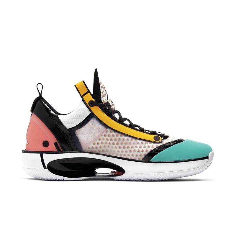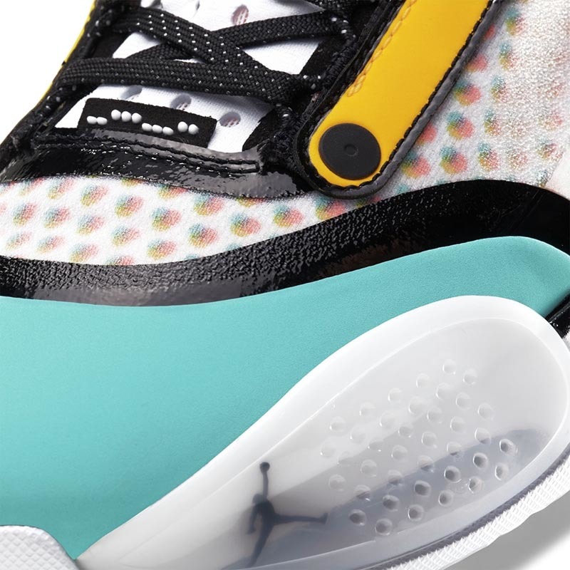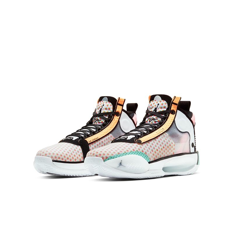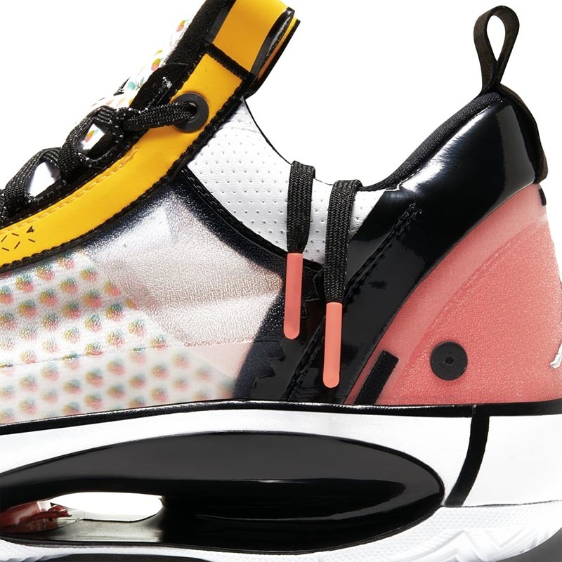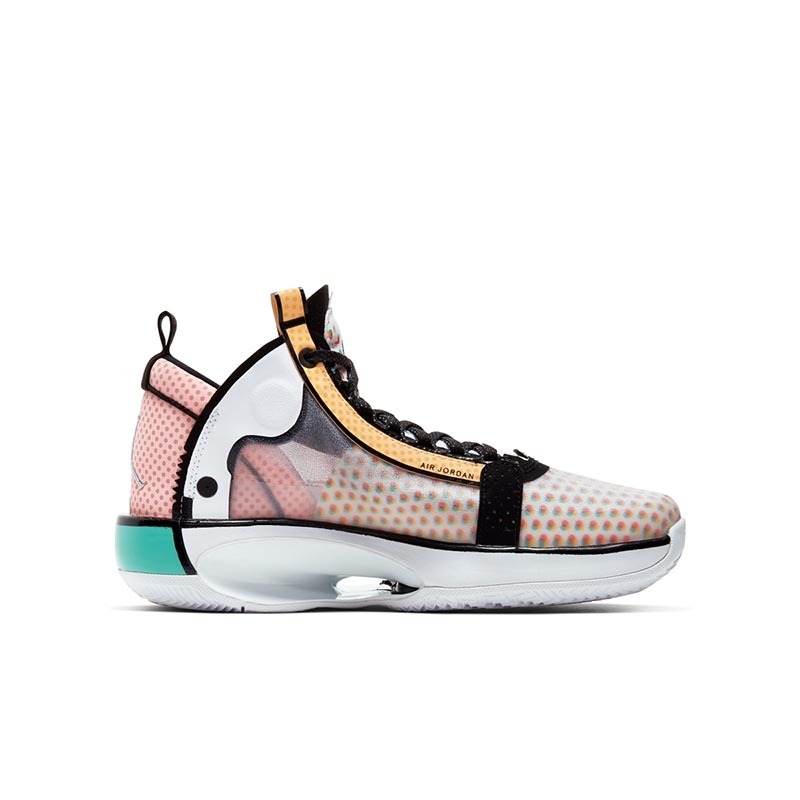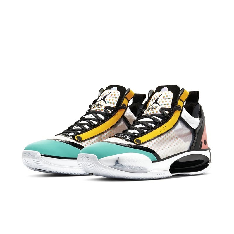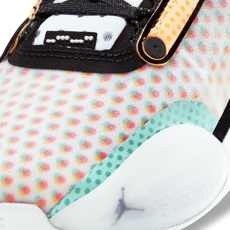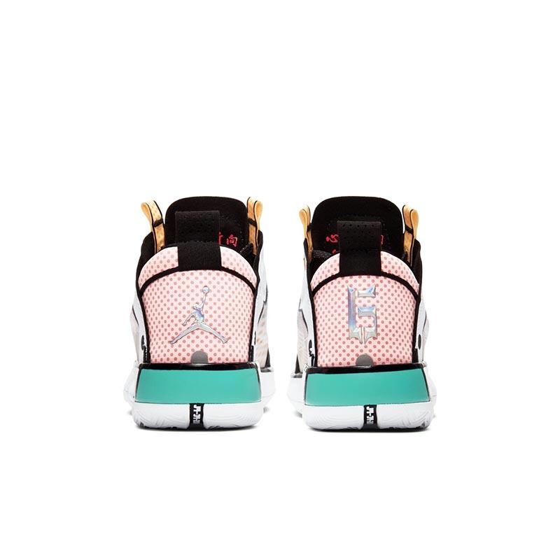而此番,依旧以 Air Jordan 34 为蓝本,品牌又为郭艾伦推出了专属配色。不同于以往标志性的中国玉色调,这款全新配色采用白色、粉色、黄色、绿色等多种色调融合打造,缤纷绚丽的视觉效果比此前的更加抢眼。