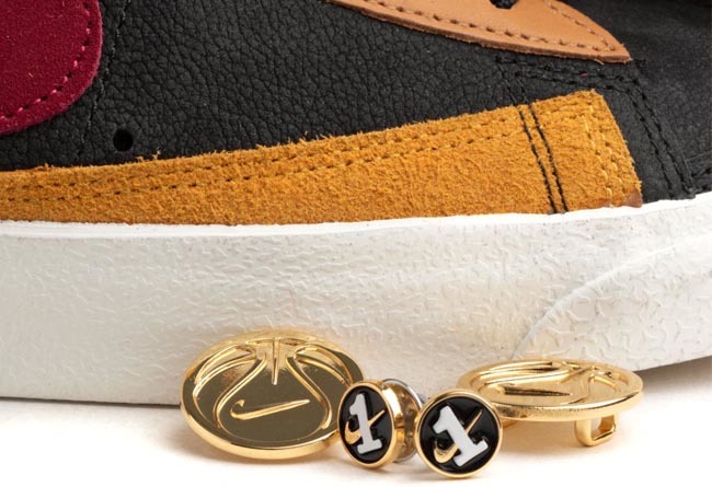 这款配色采用酒红色磨砂皮与姜黄植绒物料拼接而成,呼应传奇教练 Dorothy Gaters 执教的马歇尔高中球衣配色。而附赠的金属鞋带扣低调奢华,彰显了篮球主题魅力。