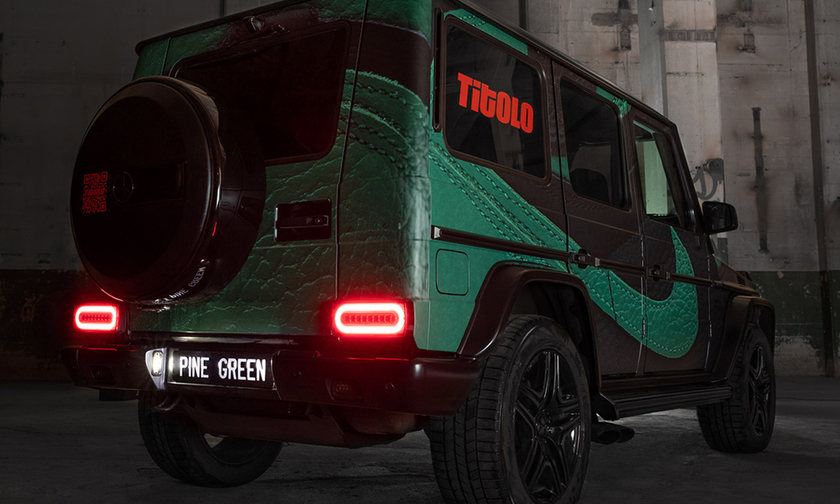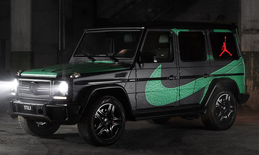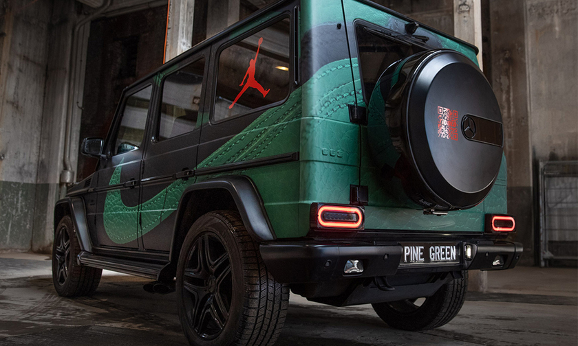 Titolo 将一辆 Mercedes G-Class 外观改造成了 Air Jordan 1 “Pine Green” 风格。黑绿主打,注入细腻的皮革纹理,质感让人惊艳。红色 Titolo logo 以及 Jumpman logo 极其醒目,呼应 AJ 1 黑绿的红色细节。