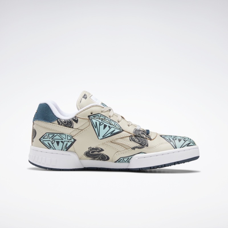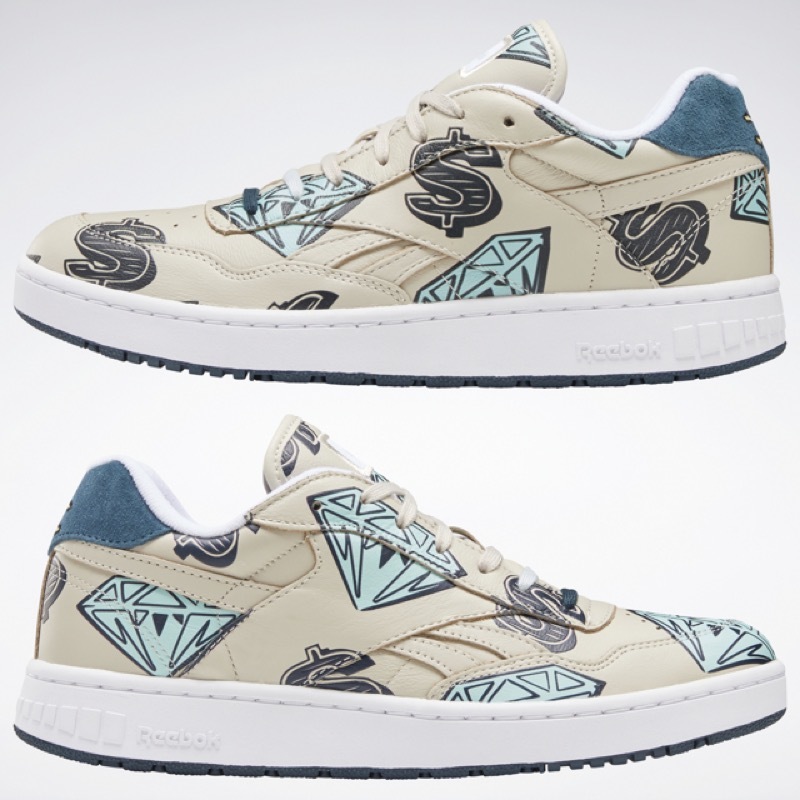 Reeboks BB4000 则以米白色调主打,钻石与美金的注入,展现了嘻哈音乐中对于美金和钻石的浮夸追求,个性满满。