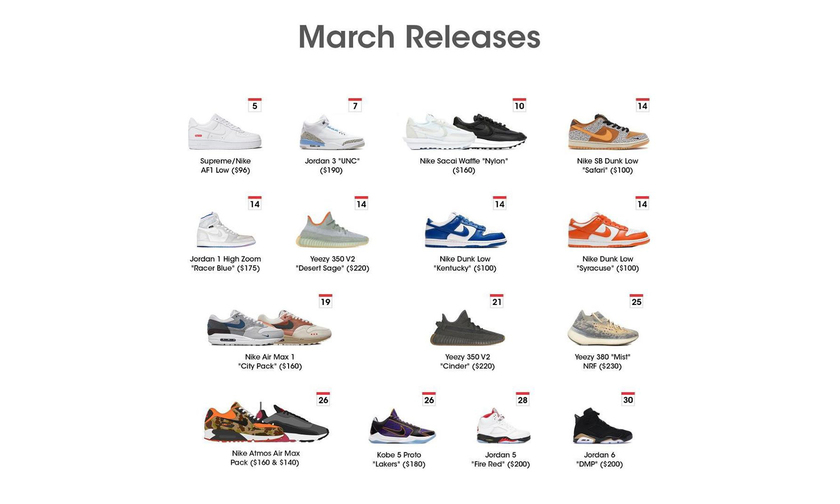 除了已经在海外发售的 Supreme x Nike Air Force 1 以及今日亮相的 AJ 3 “UNC”之外,还有 sacai x Nike LDWaffle ,Nike SB Dunk “Safari”,Nike SB Dunk 雪城大学、肯塔基大学配色,以及 Yeezy 350 V2、Yeezy 380 新配色等等。
