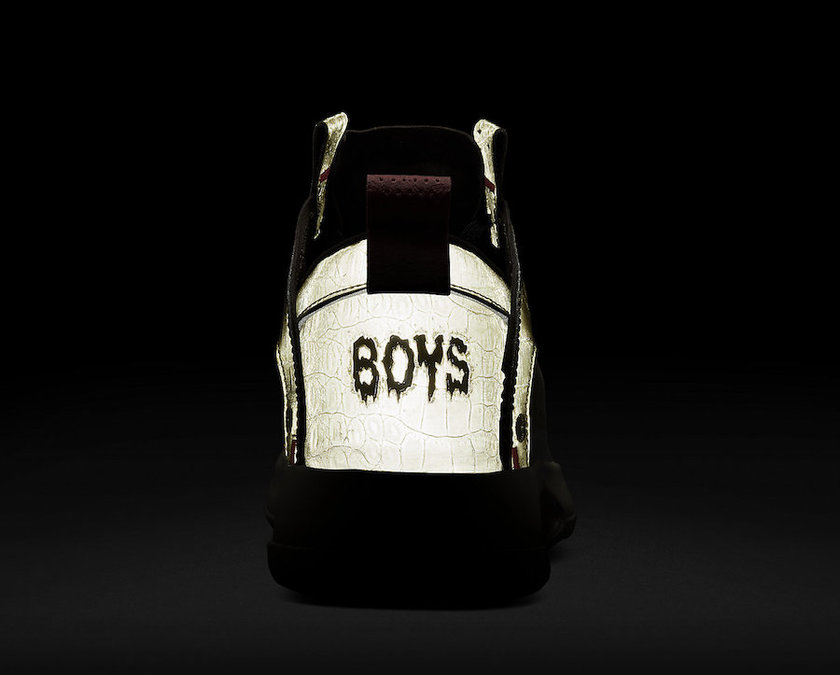 鞋款灵感来源于亚利桑那州河口的鳄鱼,鞋身色调与鹈鹕队的金色呼应,从鞋头延伸到后跟的鳄鱼元素相当狂野。搭配以极具恐怖气息的设计手法呈现的鞋头锯齿状标签以及后跟 BAYOU 字样,吸睛效果极强。