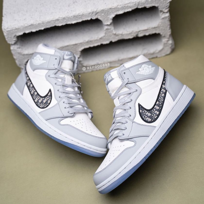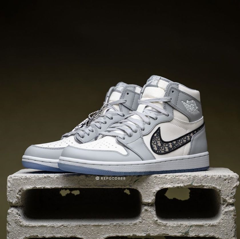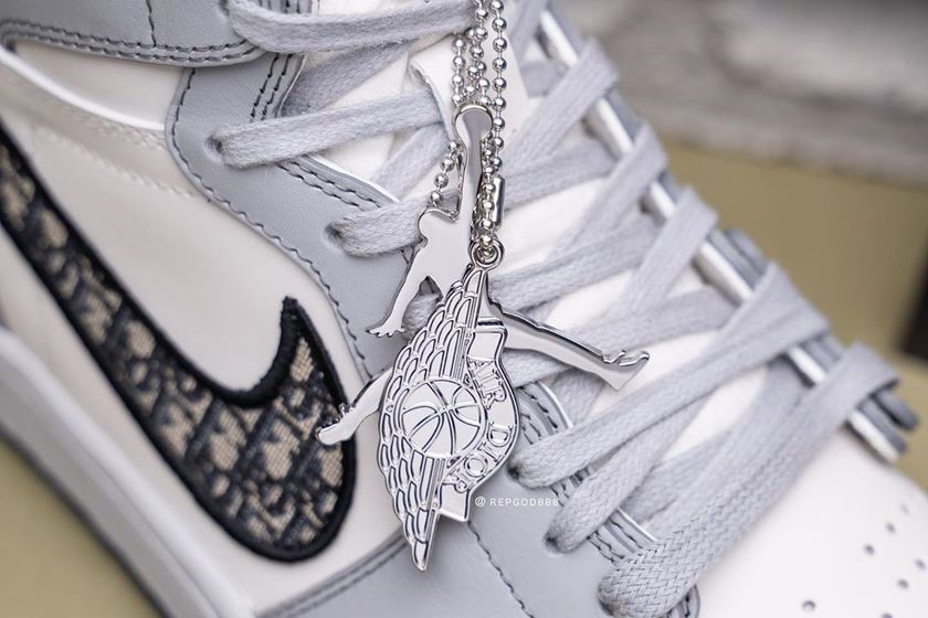 采用灰白色调主打,这款联名气质十分高级。Dior 标志性老花细节出现在 Swoosh 以及鞋舌部分,辨识度与奢华气息极强。