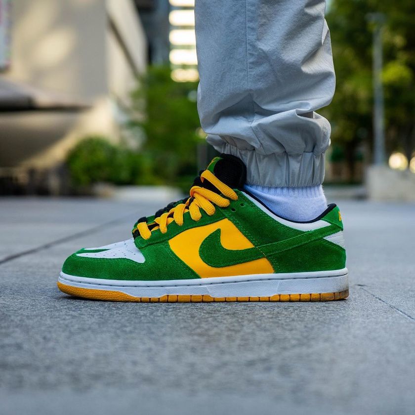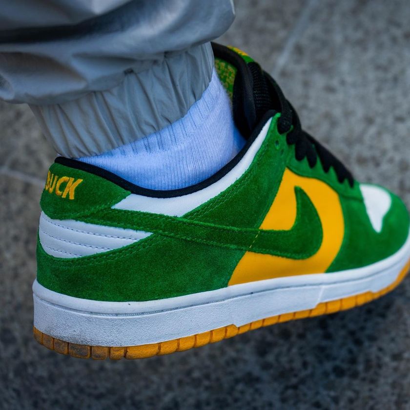 绿色与黄色两种标志性俄勒冈色调拼接搭配后跟处Buck 标识,辨识度极高。“球鞋圈顶流”Travis Scott 在去年也上脚过这款配色。