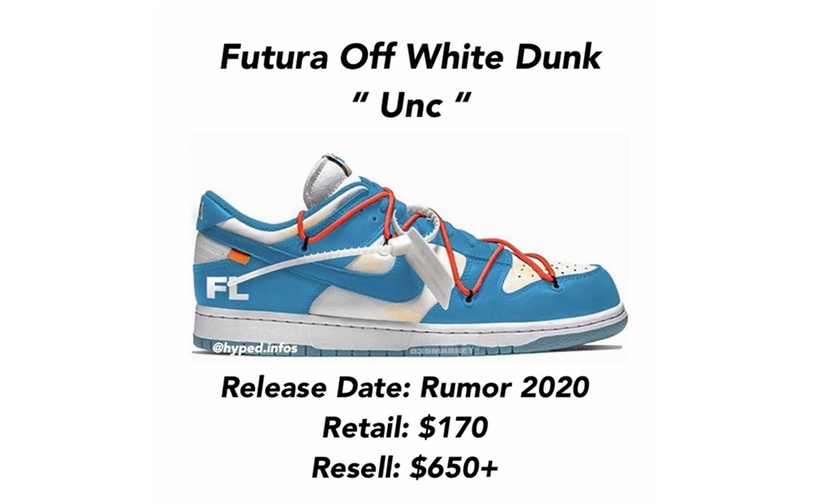 由 ins 球鞋情报账号 @hyped.infos 透露,Futura x Off-White x Nike SB Dunk Low“UNC”配色或将于 2020 年正式发售。