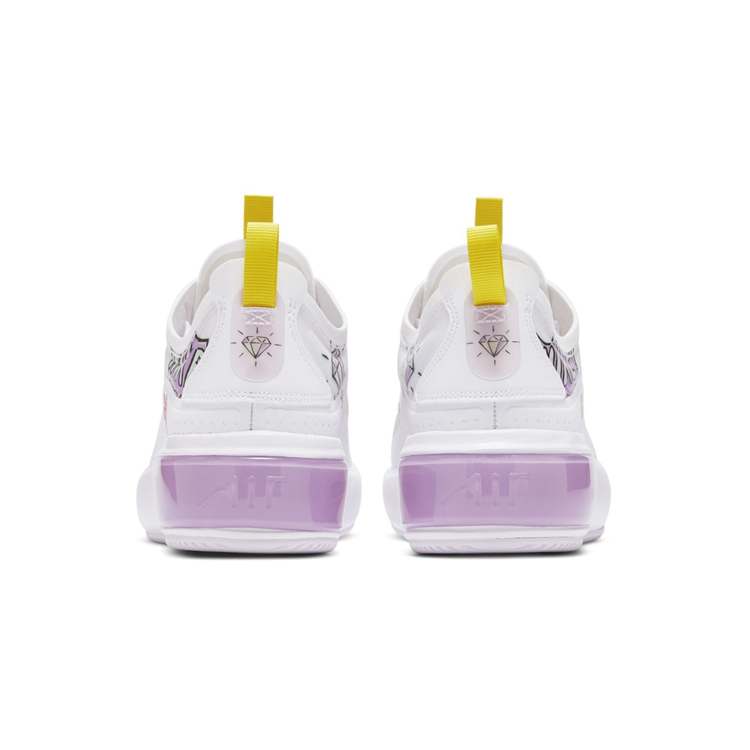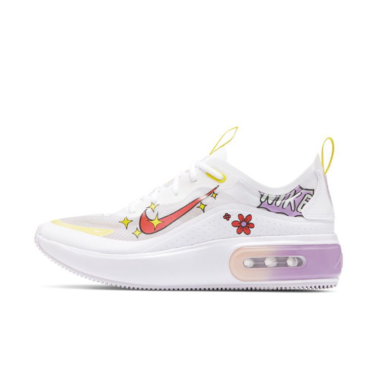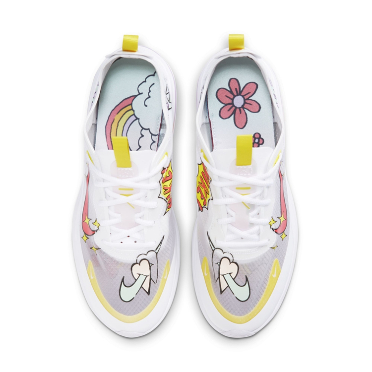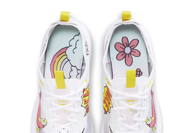 而这双鞋最大的亮点则在于遍布鞋身与鞋垫的涂鸦印花,星星、Swoosh 穿心印花、二次元风 Nike 图案还有花卉彩虹图案,带来强烈视觉冲击,活力满分。估计很少有元气少女能抵抗这款配色。